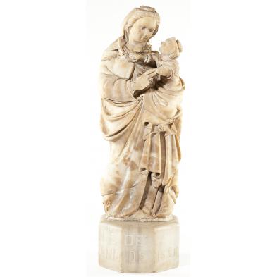 Possibly 17th century, figures carved from an attractively mottled alabaster stone in a gentle "S" curve form, mounted on an octagonal carved alabaster plinth, inscribed "Na. Sa. De Ano De 1620," Italian or Spanish.