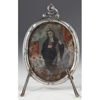 18th century, unmarked oval silver case, with bail for hanging, double sided; one side depicting Madonna of the Sacred Heart, painted on metal under glass; verso with depiction of an unidentified saint visited by angel which appears to be painted on unknown surface; under beveled glass, with later metal stand.