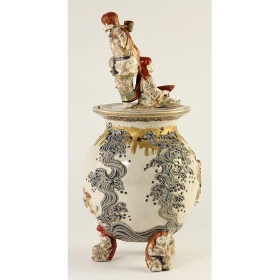 Circa 1880, the flattened disk form cover surmounted with two long red haired women in ornate brocade clothing, holding gilt and lacquered dishes, one shown seated and one shown standing, the cover rests atop an ovoid body further decorated with dancing red haired women with fans, divided by naturalistic waves and heavy gold drops at neck, all raised on three figural feet of squatting women.