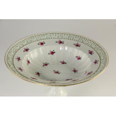 19th century, reticulated rim to bowl, hand painted with rose sprays, the bowl supported by swirled shaft and circular foot, "KPM" mark in red and also with underglaze blue scepter.
