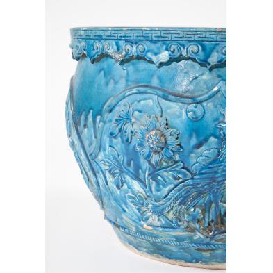 Turquoise glaze, fret scrolled rim, bird and flower relief design.