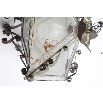 Having eight trapezoidal leaded glass panels with scrolling metal decoration.