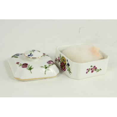 Including tall glass apothecary bottle (12.5 in.), two floral decorated porcelain dresser bottles and small dresser box (broken and repaired).