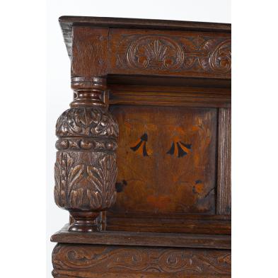 17th century with later elements incorporated, oak, rectangular top with molded edge over carved frieze projecting above single inset paneled door. Chamber with a total of (5) panels each with dark and light wood floral inlay, the top supported by ornately carved cylindrical supports. Waist supported by similar cylindrical carving with lower shelf.
