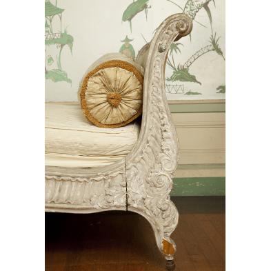 Circa 1900, carved and painted finish, each with outswept scrolled headboard and footboard, upholstered in velvet, brass nail trim, with serpentine side rails with shell motif, raised on brass caps.