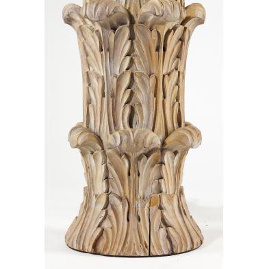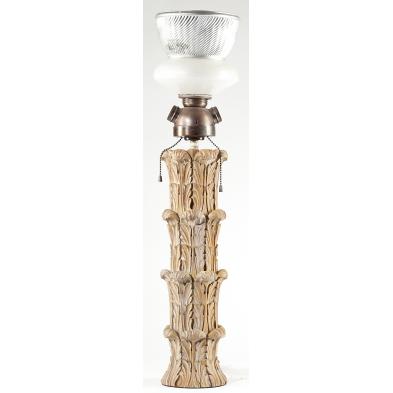 Early 20th century, bleached wood carved in foliate tiers, one with original ivory silk shade.