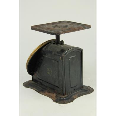 Fabulous tole ware rooster form planter (16 in.) (some rusting and wear to paint and small hole to body); set of (6) Italian rooster decorated canapes plates (one with chips to edge) (6.25 x 6.25 in.); vintage Columbia family scale with patent date 1907 (some rusting throughout) (8.25 in.).