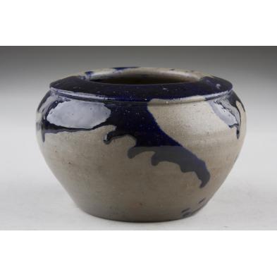 Stoneware low bowl with flat rim and thick cobalt glaze cross runs, with second stamp North State to base. Pictured in W.D. Morton, Jr's "Handmade: A History of the North State Pottery", pg.93.