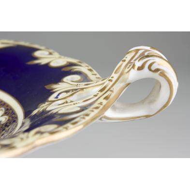 The handled tazza has four tight hairlines the plates with some gilt loss and rubbing, one plate with chip to underside.