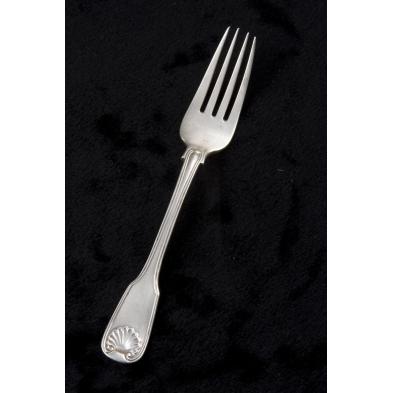(13) pieces including: a large punch ladle by John Myers, ca. 1780-1800, with bright cut engraved decoration and no monogram (4.95 troy ozs., 13.5") (with repair to handle and some bending); a sauce ladle by R. & W. Wilson (with serrated rectangular punch) and marked "STANDARD," ca. 1820-1840, with monogram "KLH" (1.75 troy ozs., 7") (no apparent condition concerns); a master salt with shell form bowl and script "K" monogram, partially rubbed mark (.25 troy ozs., 4.25") (with fissure to handle); a serving spoon with shell form bowl by Bailey & Co., ca. 1850 and bearing their pseudo hallmarks, monogrammed "TSB" (3.45 troy ozs., 10.75") (no apparent condition concerns); and a very nice set of nine shell & thread forks by R. & W. Wilson, heavy weight and of particularly good quality, ca. 1840, bearing two punches - the first "R&WW" and the second "Phia," both in a rectangular punch, script monogram "CCK" (21.35 total troy ozs., 7.25") (expected scratching and minor wear to tines).