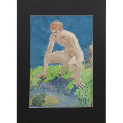 All are watercolor on paper, (3) bear an artist's monogram and are dated 1933, (2) are unsigned. (4) works are framed under glass and (1) is unframed. The overall dimensions of the frames are: (25.5" x 21.25"), (29.5" x 23"), (27" x 30"), and (21" x 25.5").
