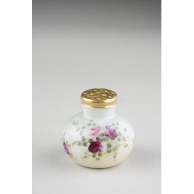 (5) pieces including: Rococo style tray, small dish, powder shaker, lidded box, and candlestick. Each item, with the exception of the shaker, bears a backstamp and is initialed "E. J. P." by the artist.