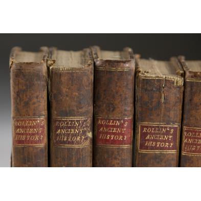 Rollin, Charles, The Ancient History of the Egyptians, Carthaginians, Assyrians, Babylonians, Medes and Persians, Macedonians and Grecians, (London: Bathurst, Nourse, Carnan, etc., 1795), approximately 4,000 pp. in ten volumes, 12mo (7" x 4.25"), full calf, engraving facing each title page, some fold-out maps.