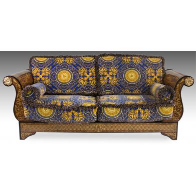 Including a love seat, a chair, and a sofa, having burl wood frames highlighted by gold line and scroll decoration, large gilt metal mounts to the sides and arms, cotton satin upholstery, each with loose back and seat cushions accompanied by rolls. Chair: 40" x 51" x 35" (height is to top of cushion); Love seat: 40" x 70" x 35"; Sofa: 40" x 91" x 35".