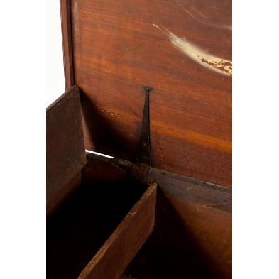 Circa 1800, walnut, with yellow pine and poplar secondary, dove-tailed and pegged case, the top with bread-board and molded edge features original fish-tail hinges, interior with till, side-by-side lipped drawers, raised on a spurred bracket foot base.