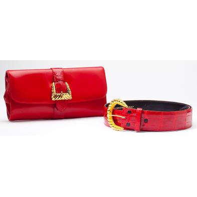 1980s, the first is a red leather clutch with red alligator trim and a gold-tone gadrooned buckle, the interior encloses a thin removable shoulder-length strap, beauty mirror and an alligator key chain, the coordinating belt with scalloped gold-tone buckle (41.5 in.); the second is a black alligator small saddle-shaped shoulder bag, the strap adjustable, the black belt with square gold-tone buckle in a diamond quilted pattern (39 in.). Bags with Kleinberg Sherrill plaque and belt buckles with stamp.