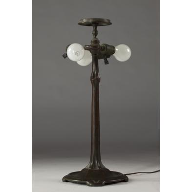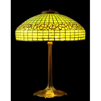 The shade composed of green leaded glass stamped "TIFFANY STUDIOS NEW YORK" (18 in. diameter) on (3) light sockets, light with verdigris patinated bronze standard stamped "TIFFANY STUDIOS NEW YORK 533." No replaced glass.