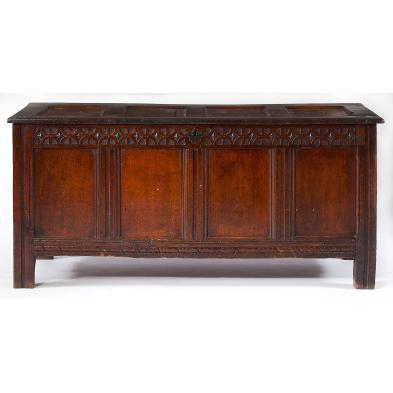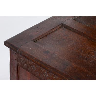 18th century or earlier, rectangular form, the top with four inset panels above a carved frieze over an inset paneled case, the skirt relief carved with scrolls, the stiles extend to form the feet; pegged construction, iron hinges.