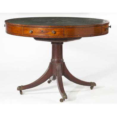 Early 19th century, circular form, mahogany and mahogany veneers, with inset green leather top and four drawers, quadruped base, with down swept reeded legs terminating in brass casters.
