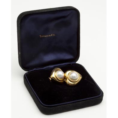 Each set with a single Mabe pearl (approximately 11.6 mm) in high relief bezel set within a heart shaped gold mounting, with Omega clip backs, stamped "1984 Tiffany and Co. 18KT.," accompanied by a Tiffany & Co. presentation box.