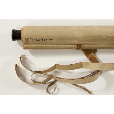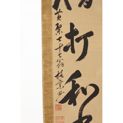 Likely Qing Dynasty, with matching silk mounts, the first is a hanging scroll painting on paper with six characters in regular script with artist seal mark; the second scroll is similar but has an inscription on the center left side, and three scattered red seal marks; the third painting has four characters, an inscription on the right side of the painting and a single red seal mark. Overall, the scrolls each measure approximately 82 x 15 in. and the paintings measure approximately 49.5 x 10.5 in.