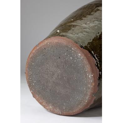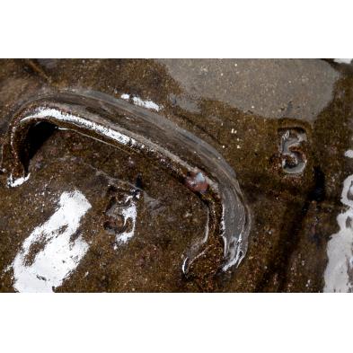 Five gallon size, large ovoid vessel with dark olive glaze and four applied lug handles, hand-inscribed at the throat "B.B.C. Vale NC" and capacity "5."
