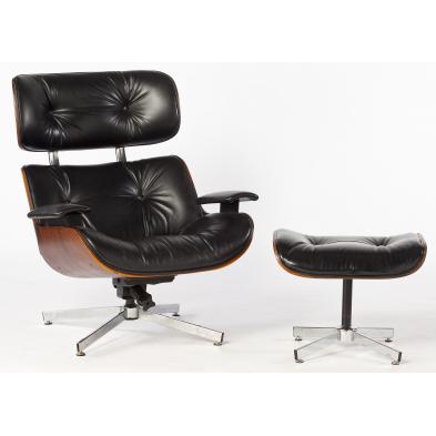 Teak, black naugahyde and chrome plated metal, swivel armchair with ottoman, Plycraft label to underside. Chair 38 x 32 x 28 in.; ottoman 17 x 21 x 17 in.