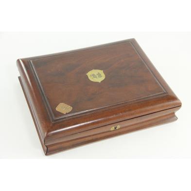 Presented in the original fitted "plum pudding" mahogany canteen with two removable trays, the hinged lid with inset brass shield form cartouche engraved with two family crests - likely indicating this was a wedding gift, the same two crests are also engraved on each silver piece.