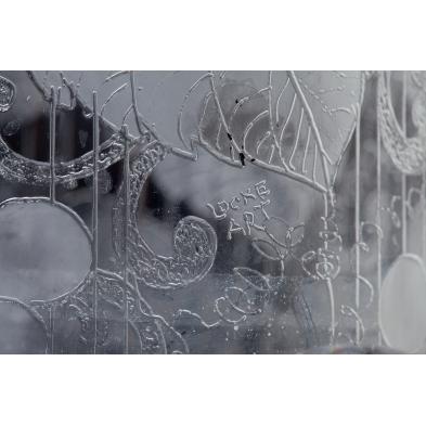 Tall cylindrical form pitcher with applied handle, etched grapevine pattern, cut and polished pontil (13.25 in.), (4) wine stems (6 3/8 in.), (2) stemmed cordials (4 3/8 in.) and (2) juice glasses (3 1/8 in.), each piece signed "Locke Art" in the pattern.