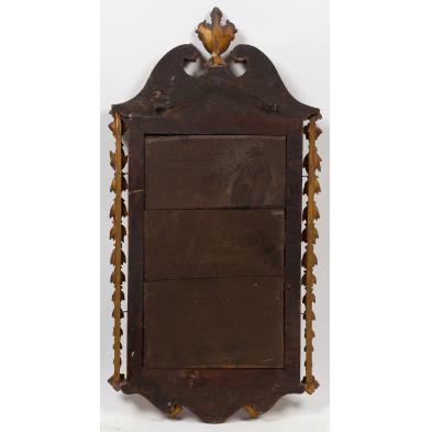 Late 19th century, the mahogany frame with applied gilt gesso urn finial, the swan's neck pediment edged with floral rosettes and garland, the stiles with floral rosettes and acanthus leaves, the scalloped base decorated with conforming rosettes and swags.