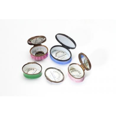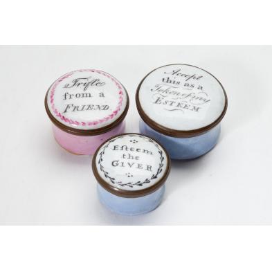 Late 18th/early 19th century, (4) of oval and hinged form with motto (3/8 x 1.17 in.) and (3) round and lidded forms with motto (.5 x 1 in.); (5) of the boxes with early Christies Auction stickers "DL 447 / SLP."