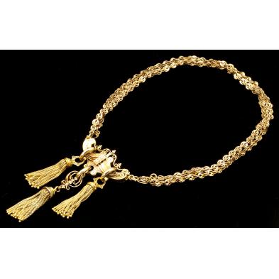 Gold brooch / pendant with scrolled form and enamel decoration centered with seed pearls and with (3) gold and enamel tassels, brooch suspended from a double fancy open link chain; unmarked and testing 14KT.