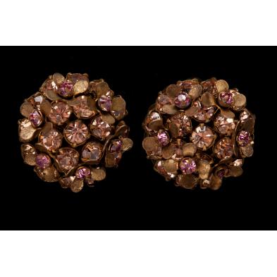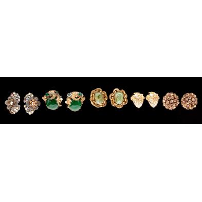American, circa 1950s-1960s, the first set with a large pear shaped rhinestone with floral overlay, the second pair set with nugget form glass tones with gold tone chain link surround, the third pair set with green stones and faux pearls, the fourth pair set with two color and size pink rhinestones among golden flower buds, and the last pair in two color metal set with aurora borealis rhinestones, all pieces stamped "Miriam Haskell".