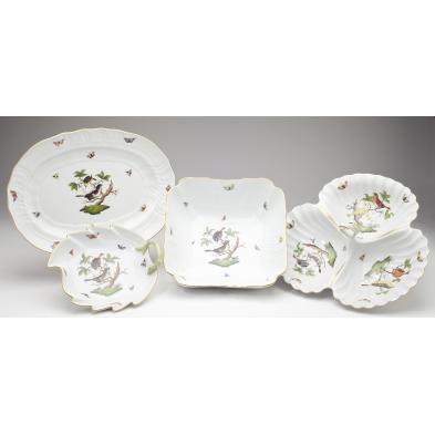To include: a leaf form serving dish (.5 x 8.5 x 7.75 in.); a large relish serving dish, three divisions each in the shape of a shell (5 x 13 in.); a platter (14.75 in.); a square salad bowl (3.75 x 3.75 x 10 in.).