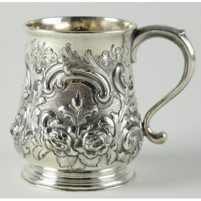 London, "GW" entwined sponsor's mark, rubbed date letter, pear form body with floral repousse decoration against a stippled ground, cast and applied scroll handle, no monogram.