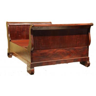 Late 19th century, mahogany and mahogany veneers, classic curved sleigh bed form with veneered rails. Interior: 55 x 72 in.