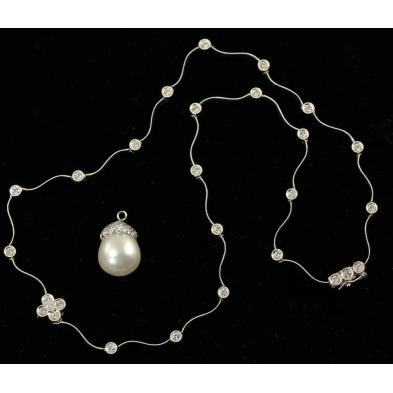 Designed with each curved "S" link alternating with a full cut round diamond bezel set, the center of the necklace features a flower motif set with diamonds with one white drop South Sea pearl (11.70mm) having excellent luster capped with diamonds (approximately .97 total carat weight), white gold mounting stamped 750. Replacement value appraisals of $5635.00