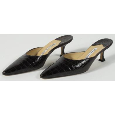 The first designed as a pair of exquisite chocolate colored crocodile mules (2 in. heel, size 36.5); and the second pair designed as black and white lizard skin pumps (2 in. heel, size 37).