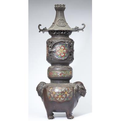 Bronze, with cloisonne elements, with one hinged door, the whole on a figural base in the form of a rather portly foo dog.