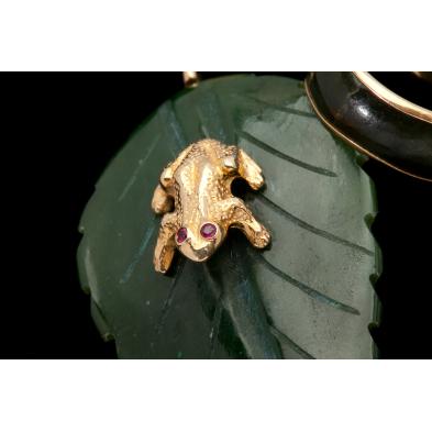Of spinach colored nephrite jade, the first designed as a leaf and frog brooch and stamped 14KT and with Gump's retailer's mark (2.25 in.); a pair of 14KT drop pendant earrings with post backs (1.25 in.); and a 14KT gold and jade band with maker's mark TG.