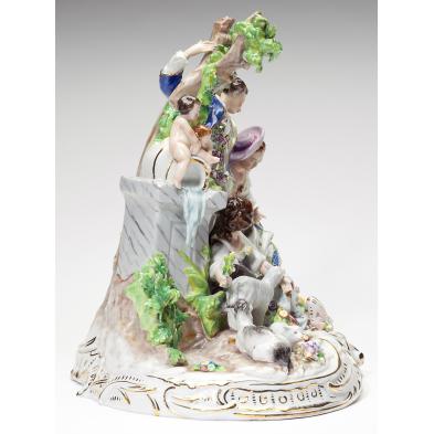 German, first half 20th century, outdoor tableau of three figures attired in 18th century costume at leisure in the countryside, with frolicking putti, on rock ground Rococo style plinth having scattered blossoms, the underside with Sitzendorf crown mark.