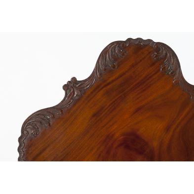 Late 19th century, exceptional quality one board mahogany top deeply carved at the border with acanthus leaves, the carving extends to the standard and knees of the cabriole legs which terminate in ball and claw feet.