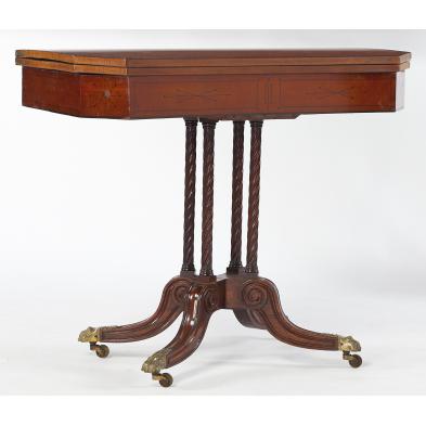 Early 19th century, mahogany and burl wood veneers, the swivel tops feature canted corners and banded mahogany veneer edge treatment over a skirt with ebonized incised compass decoration, supported by four spiral twist columns raised on carved cabriole legs terminating in brass paw feet on casters.
