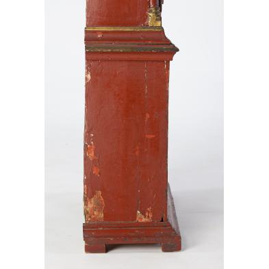 Early 19th century, case with several layers of painted color, the molded cornice is highlighted with gilt dentil molding over a glass enclosed metal face with gilt wreath surround, time and chime wind, brass works. Below the waist door, the case is further decorated with a band of gilt dentil molding and an applied gilt drapery. The face, possibly re-painted, reads "M.P. Westh. 1847". With key, single weight, pendulum.