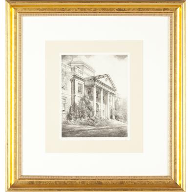 Wove paper, each titled and signed in pencil along lower margin, to include: "St. Augustine College, Raleigh, North Carolina" (sheet 15.75 x 12.5 in.; plate 9.75 x 7.75 in.) and " David (Daniel) Harvey Hill Library, North Carolina State College, Raleigh" (sheet 15.75 x 12.75 in.; plate 10 x 8 in.), presented in matching gilt wooden frames.