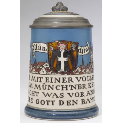 Decorated with village scene and central shield with Bishop reading "Nunchen, Wer Nie Mit Einer Vollen Maass, Auf Einem Munch'ner Keller Sass, De Weiss Nicht Was Vor Andern Volkern, Der Liebe Gott Den Bayern Gab.", stamped on underside "Mettlach, VB, Ges-Gesh, 2002, 19, II, 02," the lid decorated and marked "HB".