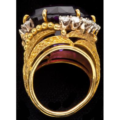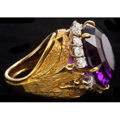 Centering on one round faceted amethyst (19.42 x 12.65 mm) weighing approximately 24.23 carats accented by (12) round brilliant cut diamonds (approximately 1.20 total carat weight) (VVS2/VS1 clarity and G/H color) in a textured and beaded 18KT yellow gold mounting.