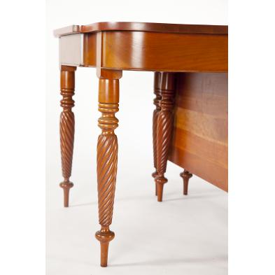 Mid 20th century, figured cherry with poplar secondary, the suite consisting of a corner cupboard with broken arch pediment and inset paneled doors (90 x 40 x 16.5 in.); a sideboard in the Late Classical style with shaped backsplash and upper drawers supported by fully turned spiral columns (51.5 x 71 x 20 in.); (12) Late Classical style side chairs with upholstered seats (34 x 16 x 17.5 in.); a Late Classical style three-part banquet table, the "D" ends each with shaped top and single drop-leaf, the center table with two drop-leaves supported by spiral turned legs (30 x 46 x 159 in.; skirt height 25 in.).