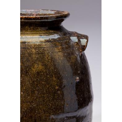 (Lincoln County, 1850-1926) dark olive alkaline glazed stoneware three gallon storage jar with high rim, line decoration to throat, applied ear handles one of which is stamped "SLH" with "3" below.