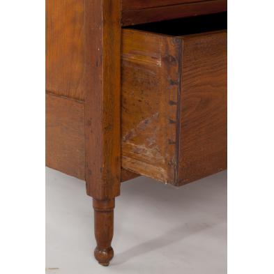 Probably North Carolina, mid 19th century, with yellow pine and poplar secondary woods, the hinged top with applied molded edge over storage well (now missing divider) and with later till above single lower drawer, paneled sides, turned feet.